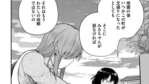 【アフタヌーン四季賞2020春 四季大賞】地震予測の技術が飛躍的に進歩した世界。その予測では、震度7の地震がおよそ2ヵ月後に来る。震源地直上の町に暮らす主人公・みさ葵の隣人たちは次々と去っていくが、旧友のアキホが突然帰郷する。大災害を目前に何を……?